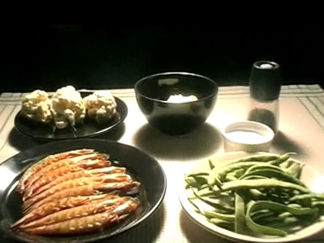 Рецепт салата из королевских креветок.Состав:креветки — 10 штук;цветная капуста — 4 кусочка;фасоль, майонез, соль, перец.