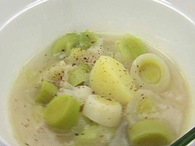 Интересное сочетание трески, лука порея и картофеля в новом супе.Состав:треска — 150 гр;лук порей — 3 щтуки;говяжий бульон — 200 гр;холодная вода — 1 стакан;чеснок — 1 зубчик;картофель — 2 штуки;соль, черный перец, оливковое масло — по вкусу.