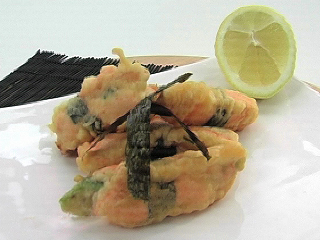 Филе лосося в нежном сливочном соусе.Состав:лосось — 250 гр;картофельная мука — 2 столовых ложки;зеленый лук — 2 чайных ложки;оливковое масло — 50 гр;яйцо — 1 штука;сливочный сыр — 1 столовая ложка;авокадо — 1/4 штуки;нори — 1 лист.